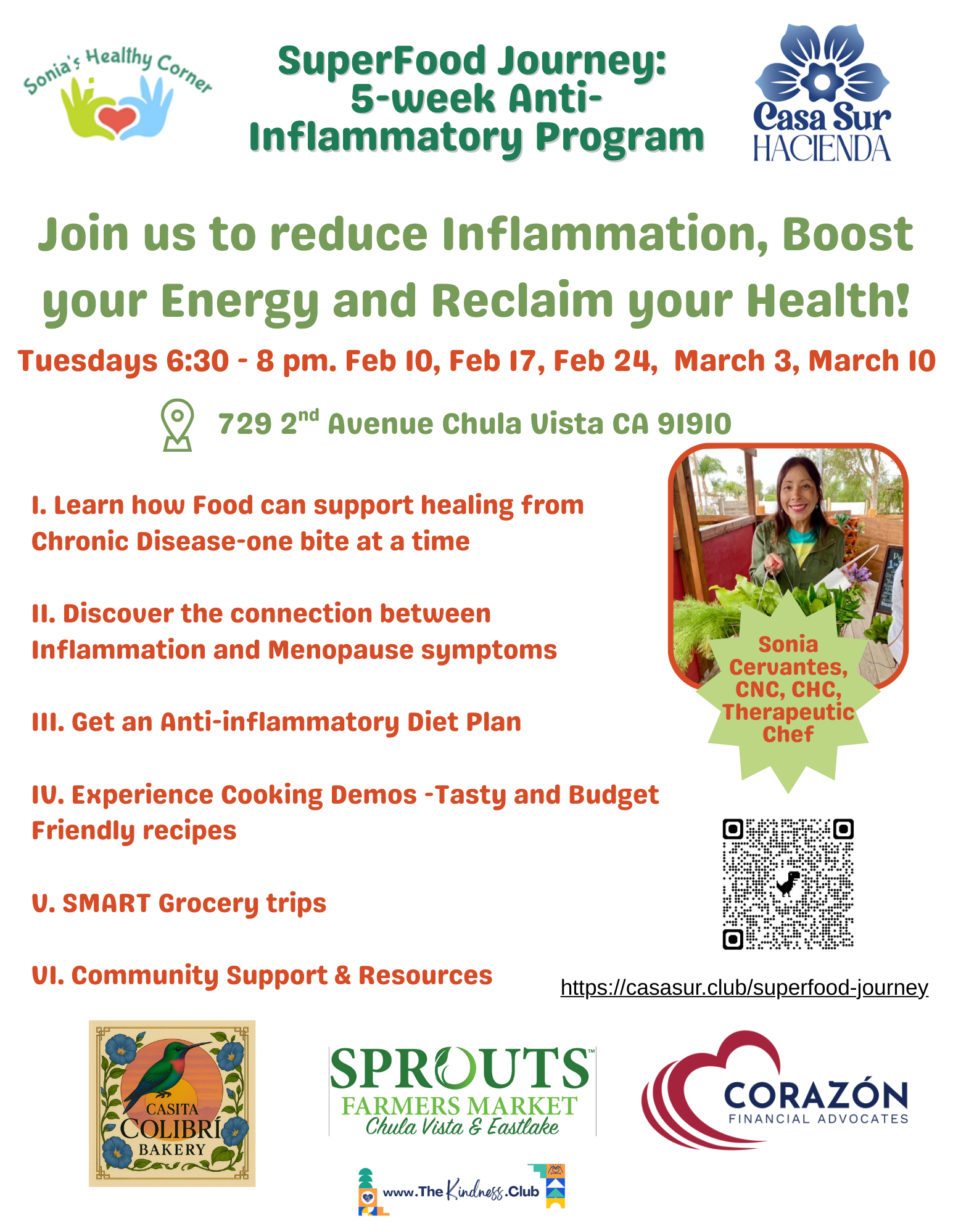 Join Nutritionist, Health Coach and Therapeutic Chef, Sonia Cervantes for a 5-week series designed to empower you to make 2026 your healthiest year! Combat inflammation, increase vitality, manage your weight, and fight disease one bite at a time, through evidence-based nutrition and lifestyle.